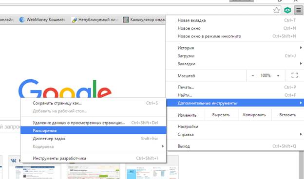 Работу по удалению рекламы нужно начать с проверки имеющихся расширений, которые установлены и включены в вашем браузере. Чтобы это сделать, например, в Chrom, нужно зайти в «Меню», нажать на «Дополнительные материалы» и выбрать пункт «Расширения»: