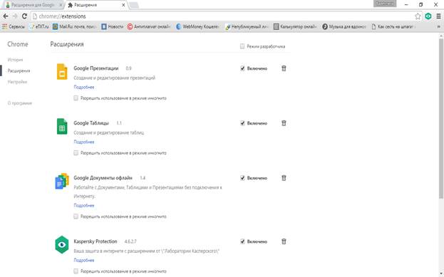 Теперь нужно внимательно просмотреть ваши расширения и выявить самые подозрительные из них. На данной картинке все расширения от официальных программ, значит, всё в порядке. Если же в вашем списке нашлось что-то ненужное, то просто отключите это расширение, а можно и вовсе удалить его. После этого действия можно открыть любой сайт в браузере и проверить наличие рекламы на нём, если ничего не изменилось, то можно отключить сразу все расширения и снова проверить, а потом включать по одному. Так, вы наверняка найдёте лишний элемент.