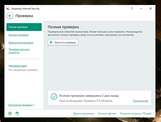 Не лишним будет и установка антивируса (если у вас его нет) и запуск полной проверки. Лучше всего чистить свой компьютер на два раза с помощью разных программ. Одной из лучших считается антивирус Касперского.